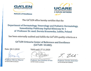 Klinika Dermatologii, Wenerologii i Dermatologii Dziecięcej w Lublinie od 28.11.2018 jest certyfikowanym ośrodkiem zajmującym się diagnostyką i leczeniem pokrzywki przewlekłej, zrzeszonym w międzynarodowej sieci GA²LEN UCARE (Global Allergy and Asthma European Network Urticaria Center of Reference and Excellence), a od 20.01.2020 również obrzęku naczynioruchowego w ramach GA²LEN HAEi ACARE (Angioedema Centers of Reference and Excellence). Dzięki współpracy międzynarodowej pracownicy Kliniki mają dostęp do licznych szkoleń, webinarów, spotkań z ekspertami oraz uczestniczą w różnych projektach naukowych mających na celu poszerzenie wiedzy na temat patogenezy, diagnostyki i leczenia pokrzywki. Klinika Dermatologii, Wenerologii i Dermatologii Dziecięcej w Lublinie corocznie dnia 1 października uczestniczy w obchodach Światowego Dnia Pokrzywki, który jest organizowany z inicjatywy UCARE.